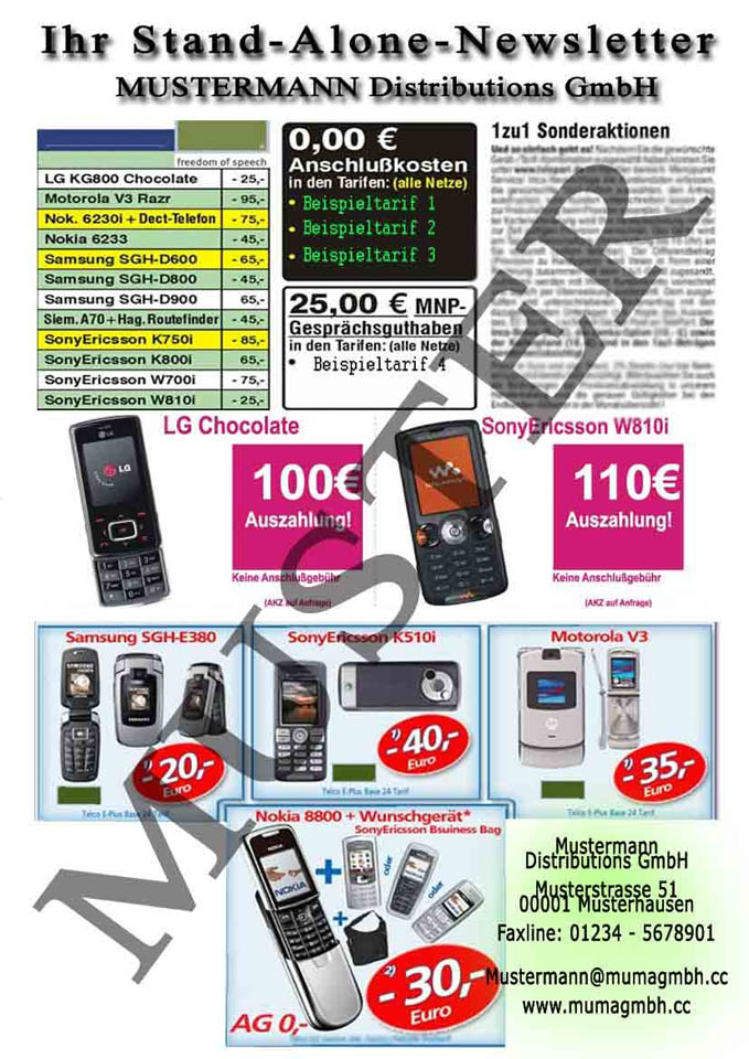 Als Handy Grosshandel, Handy Restposten Handel, IT-Grosshandel, sowie Grosshandel aus anderen Bereichen haben Sie mit unserer Aktionsmail einen neuen effektiven Vertriebskanal.